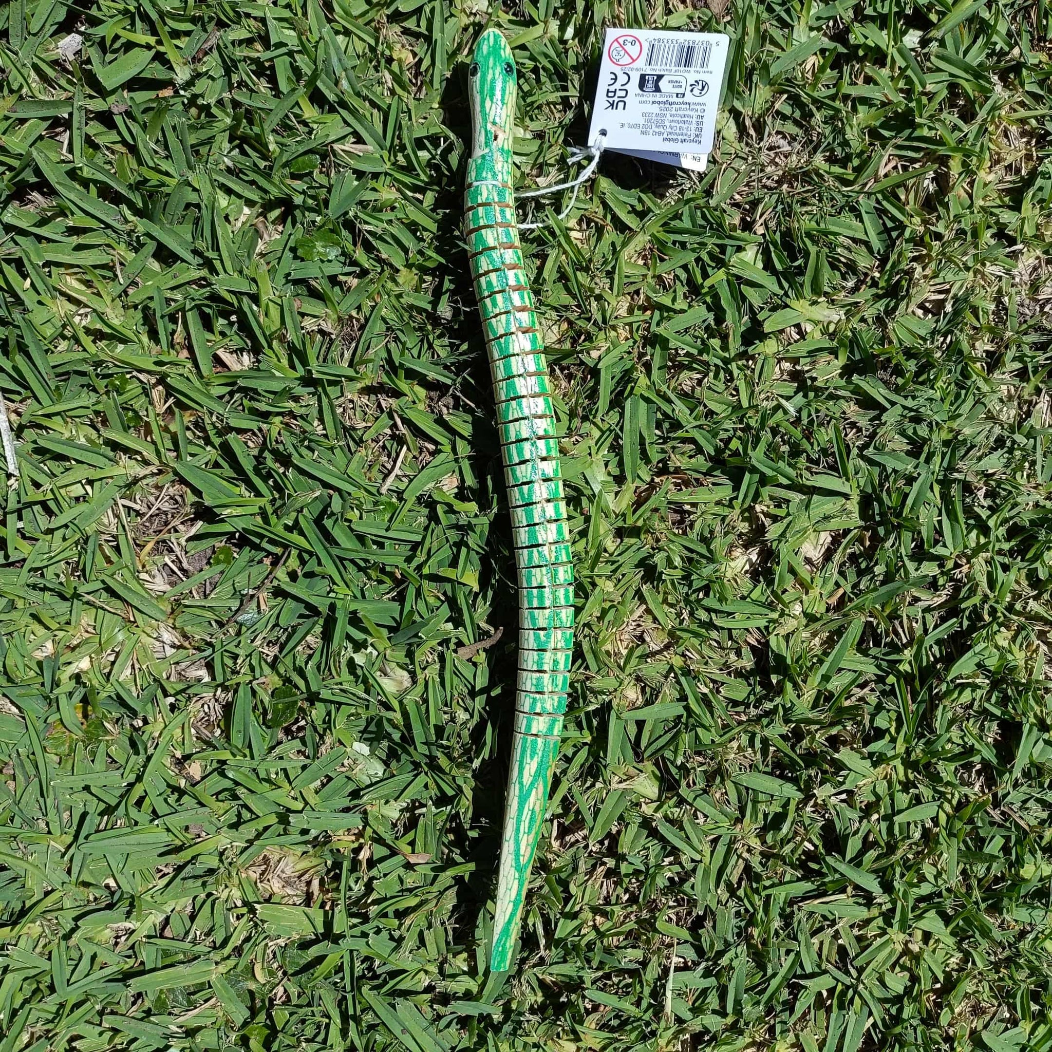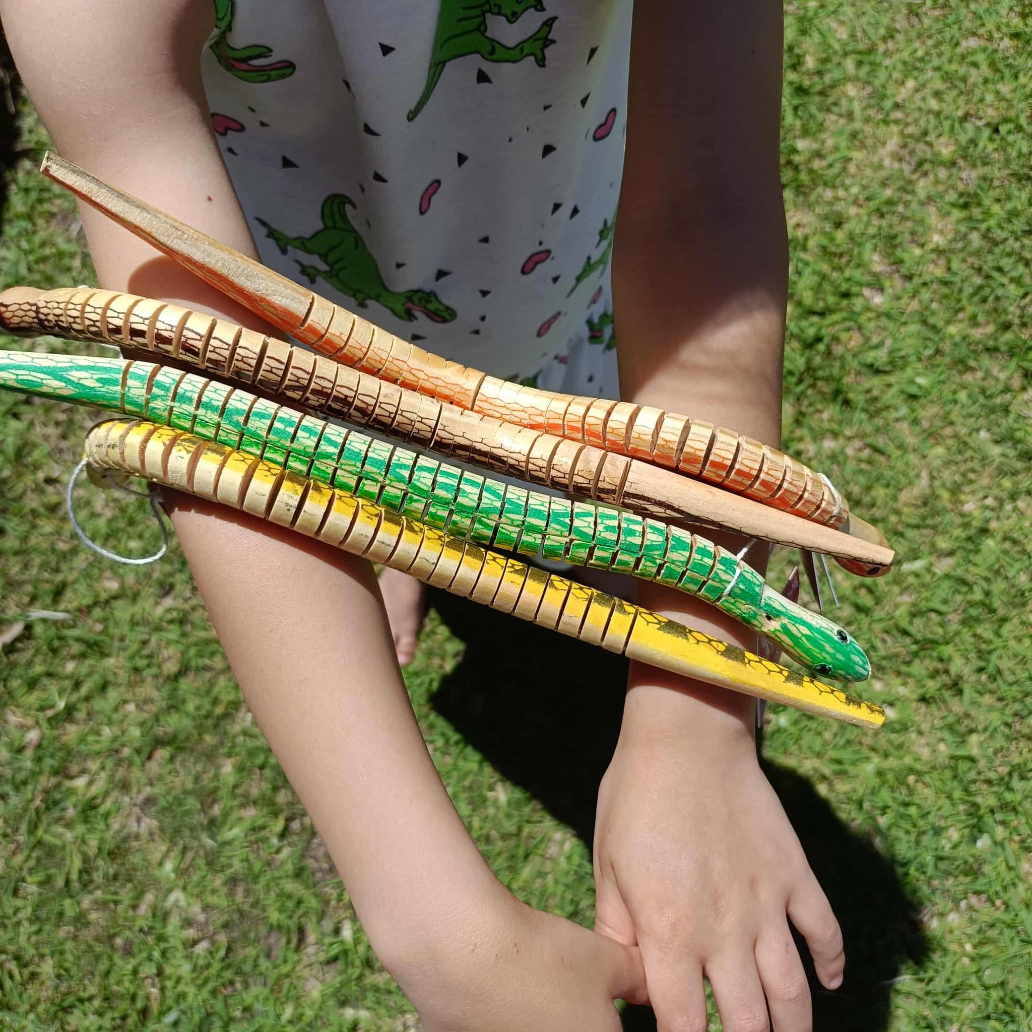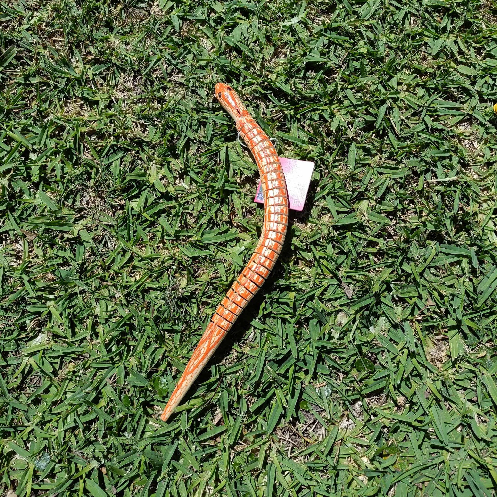 Made of a wood and comes in 4 different coloured snake pattern designs - Brown, Yellow, Green or Orange.